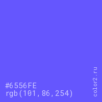 Цвет #6556FE в цветовой модели RGB обозначается тремя октетами (101, 86, 254) в десятичном формате и #6556FE в шестнадцатиричном (hex) формате, которые являются интенсивностью красного 101 (hex 65), интенсивность зелёного 86 (hex 56) и интенсивность синего 254 (hex FE).