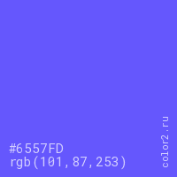 Цвет #6557FD в цветовой модели RGB обозначается тремя октетами (101, 87, 253) в десятичном формате и #6557FD в шестнадцатиричном (hex) формате, которые являются интенсивностью красного 101 (hex 65), интенсивность зелёного 87 (hex 57) и интенсивность синего 253 (hex FD).