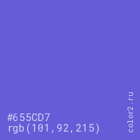 Цвет #655CD7 в цветовой модели RGB обозначается тремя октетами (101, 92, 215) в десятичном формате и #655CD7 в шестнадцатиричном (hex) формате, которые являются интенсивностью красного 101 (hex 65), интенсивность зелёного 92 (hex 5C) и интенсивность синего 215 (hex D7).