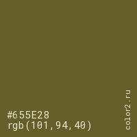 Цвет #655E28 в цветовой модели RGB обозначается тремя октетами (101, 94, 40) в десятичном формате и #655E28 в шестнадцатиричном (hex) формате, которые являются интенсивностью красного 101 (hex 65), интенсивность зелёного 94 (hex 5E) и интенсивность синего 40 (hex 28).
