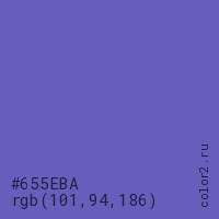 Цвет #655EBA в цветовой модели RGB обозначается тремя октетами (101, 94, 186) в десятичном формате и #655EBA в шестнадцатиричном (hex) формате, которые являются интенсивностью красного 101 (hex 65), интенсивность зелёного 94 (hex 5E) и интенсивность синего 186 (hex BA).