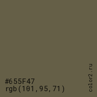 Цвет #655F47 в цветовой модели RGB обозначается тремя октетами (101, 95, 71) в десятичном формате и #655F47 в шестнадцатиричном (hex) формате, которые являются интенсивностью красного 101 (hex 65), интенсивность зелёного 95 (hex 5F) и интенсивность синего 71 (hex 47).