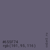 Цвет #655F74 в цветовой модели RGB обозначается тремя октетами (101, 95, 116) в десятичном формате и #655F74 в шестнадцатиричном (hex) формате, которые являются интенсивностью красного 101 (hex 65), интенсивность зелёного 95 (hex 5F) и интенсивность синего 116 (hex 74).