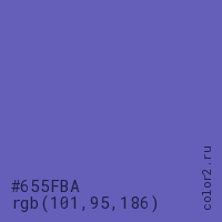 Цвет #655FBA в цветовой модели RGB обозначается тремя октетами (101, 95, 186) в десятичном формате и #655FBA в шестнадцатиричном (hex) формате, которые являются интенсивностью красного 101 (hex 65), интенсивность зелёного 95 (hex 5F) и интенсивность синего 186 (hex BA).