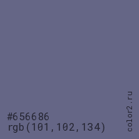 Цвет #656686 в цветовой модели RGB обозначается тремя октетами (101, 102, 134) в десятичном формате и #656686 в шестнадцатиричном (hex) формате, которые являются интенсивностью красного 101 (hex 65), интенсивность зелёного 102 (hex 66) и интенсивность синего 134 (hex 86).