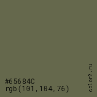Цвет #65684C в цветовой модели RGB обозначается тремя октетами (101, 104, 76) в десятичном формате и #65684C в шестнадцатиричном (hex) формате, которые являются интенсивностью красного 101 (hex 65), интенсивность зелёного 104 (hex 68) и интенсивность синего 76 (hex 4C).