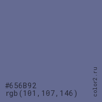 Цвет #656B92 в цветовой модели RGB обозначается тремя октетами (101, 107, 146) в десятичном формате и #656B92 в шестнадцатиричном (hex) формате, которые являются интенсивностью красного 101 (hex 65), интенсивность зелёного 107 (hex 6B) и интенсивность синего 146 (hex 92).