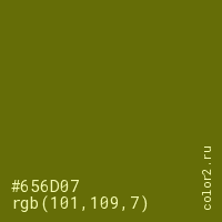 Цвет #656D07 в цветовой модели RGB обозначается тремя октетами (101, 109, 7) в десятичном формате и #656D07 в шестнадцатиричном (hex) формате, которые являются интенсивностью красного 101 (hex 65), интенсивность зелёного 109 (hex 6D) и интенсивность синего 7 (hex 07).