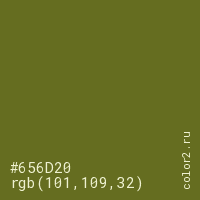 Цвет #656D20 в цветовой модели RGB обозначается тремя октетами (101, 109, 32) в десятичном формате и #656D20 в шестнадцатиричном (hex) формате, которые являются интенсивностью красного 101 (hex 65), интенсивность зелёного 109 (hex 6D) и интенсивность синего 32 (hex 20).