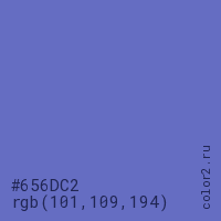 Цвет #656DC2 в цветовой модели RGB обозначается тремя октетами (101, 109, 194) в десятичном формате и #656DC2 в шестнадцатиричном (hex) формате, которые являются интенсивностью красного 101 (hex 65), интенсивность зелёного 109 (hex 6D) и интенсивность синего 194 (hex C2).