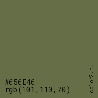 Цвет #656E46 в цветовой модели RGB обозначается тремя октетами (101, 110, 70) в десятичном формате и #656E46 в шестнадцатиричном (hex) формате, которые являются интенсивностью красного 101 (hex 65), интенсивность зелёного 110 (hex 6E) и интенсивность синего 70 (hex 46).
