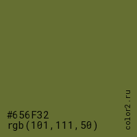 Цвет #656F32 в цветовой модели RGB обозначается тремя октетами (101, 111, 50) в десятичном формате и #656F32 в шестнадцатиричном (hex) формате, которые являются интенсивностью красного 101 (hex 65), интенсивность зелёного 111 (hex 6F) и интенсивность синего 50 (hex 32).