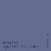 Цвет #656F92 в цветовой модели RGB обозначается тремя октетами (101, 111, 146) в десятичном формате и #656F92 в шестнадцатиричном (hex) формате, которые являются интенсивностью красного 101 (hex 65), интенсивность зелёного 111 (hex 6F) и интенсивность синего 146 (hex 92).