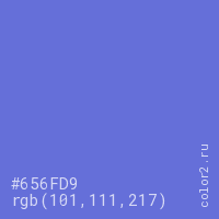 Цвет #656FD9 в цветовой модели RGB обозначается тремя октетами (101, 111, 217) в десятичном формате и #656FD9 в шестнадцатиричном (hex) формате, которые являются интенсивностью красного 101 (hex 65), интенсивность зелёного 111 (hex 6F) и интенсивность синего 217 (hex D9).