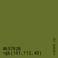 Цвет #65702B в цветовой модели RGB обозначается тремя октетами (101, 112, 43) в десятичном формате и #65702B в шестнадцатиричном (hex) формате, которые являются интенсивностью красного 101 (hex 65), интенсивность зелёного 112 (hex 70) и интенсивность синего 43 (hex 2B).