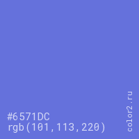 Цвет #6571DC в цветовой модели RGB обозначается тремя октетами (101, 113, 220) в десятичном формате и #6571DC в шестнадцатиричном (hex) формате, которые являются интенсивностью красного 101 (hex 65), интенсивность зелёного 113 (hex 71) и интенсивность синего 220 (hex DC).
