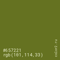 Цвет #657221 в цветовой модели RGB обозначается тремя октетами (101, 114, 33) в десятичном формате и #657221 в шестнадцатиричном (hex) формате, которые являются интенсивностью красного 101 (hex 65), интенсивность зелёного 114 (hex 72) и интенсивность синего 33 (hex 21).