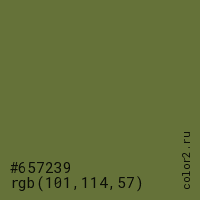 Цвет #657239 в цветовой модели RGB обозначается тремя октетами (101, 114, 57) в десятичном формате и #657239 в шестнадцатиричном (hex) формате, которые являются интенсивностью красного 101 (hex 65), интенсивность зелёного 114 (hex 72) и интенсивность синего 57 (hex 39).