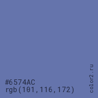 Цвет #6574AC в цветовой модели RGB обозначается тремя октетами (101, 116, 172) в десятичном формате и #6574AC в шестнадцатиричном (hex) формате, которые являются интенсивностью красного 101 (hex 65), интенсивность зелёного 116 (hex 74) и интенсивность синего 172 (hex AC).