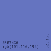 Цвет #6574C0 в цветовой модели RGB обозначается тремя октетами (101, 116, 192) в десятичном формате и #6574C0 в шестнадцатиричном (hex) формате, которые являются интенсивностью красного 101 (hex 65), интенсивность зелёного 116 (hex 74) и интенсивность синего 192 (hex C0).
