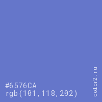 Цвет #6576CA в цветовой модели RGB обозначается тремя октетами (101, 118, 202) в десятичном формате и #6576CA в шестнадцатиричном (hex) формате, которые являются интенсивностью красного 101 (hex 65), интенсивность зелёного 118 (hex 76) и интенсивность синего 202 (hex CA).