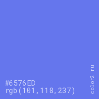 Цвет #6576ED в цветовой модели RGB обозначается тремя октетами (101, 118, 237) в десятичном формате и #6576ED в шестнадцатиричном (hex) формате, которые являются интенсивностью красного 101 (hex 65), интенсивность зелёного 118 (hex 76) и интенсивность синего 237 (hex ED).