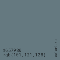 Цвет #657980 в цветовой модели RGB обозначается тремя октетами (101, 121, 128) в десятичном формате и #657980 в шестнадцатиричном (hex) формате, которые являются интенсивностью красного 101 (hex 65), интенсивность зелёного 121 (hex 79) и интенсивность синего 128 (hex 80).