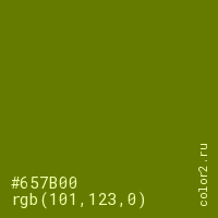 Цвет #657B00 в цветовой модели RGB обозначается тремя октетами (101, 123, 0) в десятичном формате и #657B00 в шестнадцатиричном (hex) формате, которые являются интенсивностью красного 101 (hex 65), интенсивность зелёного 123 (hex 7B) и интенсивность синего 0 (hex 00).