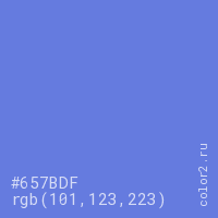 Цвет #657BDF в цветовой модели RGB обозначается тремя октетами (101, 123, 223) в десятичном формате и #657BDF в шестнадцатиричном (hex) формате, которые являются интенсивностью красного 101 (hex 65), интенсивность зелёного 123 (hex 7B) и интенсивность синего 223 (hex DF).