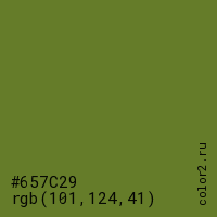 Цвет #657C29 в цветовой модели RGB обозначается тремя октетами (101, 124, 41) в десятичном формате и #657C29 в шестнадцатиричном (hex) формате, которые являются интенсивностью красного 101 (hex 65), интенсивность зелёного 124 (hex 7C) и интенсивность синего 41 (hex 29).