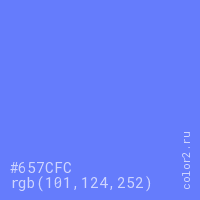 Цвет #657CFC в цветовой модели RGB обозначается тремя октетами (101, 124, 252) в десятичном формате и #657CFC в шестнадцатиричном (hex) формате, которые являются интенсивностью красного 101 (hex 65), интенсивность зелёного 124 (hex 7C) и интенсивность синего 252 (hex FC).