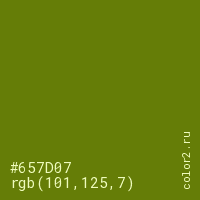 Цвет #657D07 в цветовой модели RGB обозначается тремя октетами (101, 125, 7) в десятичном формате и #657D07 в шестнадцатиричном (hex) формате, которые являются интенсивностью красного 101 (hex 65), интенсивность зелёного 125 (hex 7D) и интенсивность синего 7 (hex 07).