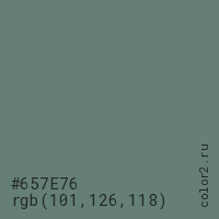 Цвет #657E76 в цветовой модели RGB обозначается тремя октетами (101, 126, 118) в десятичном формате и #657E76 в шестнадцатиричном (hex) формате, которые являются интенсивностью красного 101 (hex 65), интенсивность зелёного 126 (hex 7E) и интенсивность синего 118 (hex 76).