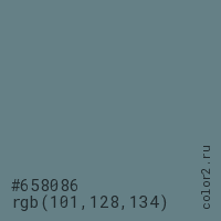 Цвет #658086 в цветовой модели RGB обозначается тремя октетами (101, 128, 134) в десятичном формате и #658086 в шестнадцатиричном (hex) формате, которые являются интенсивностью красного 101 (hex 65), интенсивность зелёного 128 (hex 80) и интенсивность синего 134 (hex 86).