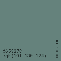 Цвет #65827C в цветовой модели RGB обозначается тремя октетами (101, 130, 124) в десятичном формате и #65827C в шестнадцатиричном (hex) формате, которые являются интенсивностью красного 101 (hex 65), интенсивность зелёного 130 (hex 82) и интенсивность синего 124 (hex 7C).