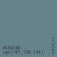 Цвет #65828D в цветовой модели RGB обозначается тремя октетами (101, 130, 141) в десятичном формате и #65828D в шестнадцатиричном (hex) формате, которые являются интенсивностью красного 101 (hex 65), интенсивность зелёного 130 (hex 82) и интенсивность синего 141 (hex 8D).
