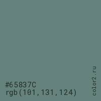 Цвет #65837C в цветовой модели RGB обозначается тремя октетами (101, 131, 124) в десятичном формате и #65837C в шестнадцатиричном (hex) формате, которые являются интенсивностью красного 101 (hex 65), интенсивность зелёного 131 (hex 83) и интенсивность синего 124 (hex 7C).