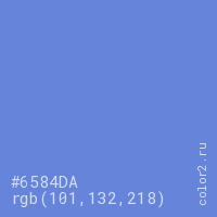 Цвет #6584DA в цветовой модели RGB обозначается тремя октетами (101, 132, 218) в десятичном формате и #6584DA в шестнадцатиричном (hex) формате, которые являются интенсивностью красного 101 (hex 65), интенсивность зелёного 132 (hex 84) и интенсивность синего 218 (hex DA).