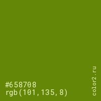 Цвет #658708 в цветовой модели RGB обозначается тремя октетами (101, 135, 8) в десятичном формате и #658708 в шестнадцатиричном (hex) формате, которые являются интенсивностью красного 101 (hex 65), интенсивность зелёного 135 (hex 87) и интенсивность синего 8 (hex 08).