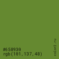 Цвет #658930 в цветовой модели RGB обозначается тремя октетами (101, 137, 48) в десятичном формате и #658930 в шестнадцатиричном (hex) формате, которые являются интенсивностью красного 101 (hex 65), интенсивность зелёного 137 (hex 89) и интенсивность синего 48 (hex 30).