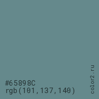 Цвет #65898C в цветовой модели RGB обозначается тремя октетами (101, 137, 140) в десятичном формате и #65898C в шестнадцатиричном (hex) формате, которые являются интенсивностью красного 101 (hex 65), интенсивность зелёного 137 (hex 89) и интенсивность синего 140 (hex 8C).