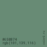 Цвет #658B74 в цветовой модели RGB обозначается тремя октетами (101, 139, 116) в десятичном формате и #658B74 в шестнадцатиричном (hex) формате, которые являются интенсивностью красного 101 (hex 65), интенсивность зелёного 139 (hex 8B) и интенсивность синего 116 (hex 74).