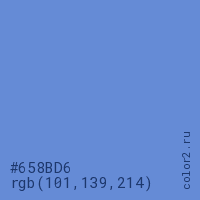 Цвет #658BD6 в цветовой модели RGB обозначается тремя октетами (101, 139, 214) в десятичном формате и #658BD6 в шестнадцатиричном (hex) формате, которые являются интенсивностью красного 101 (hex 65), интенсивность зелёного 139 (hex 8B) и интенсивность синего 214 (hex D6).