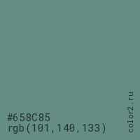 Цвет #658C85 в цветовой модели RGB обозначается тремя октетами (101, 140, 133) в десятичном формате и #658C85 в шестнадцатиричном (hex) формате, которые являются интенсивностью красного 101 (hex 65), интенсивность зелёного 140 (hex 8C) и интенсивность синего 133 (hex 85).