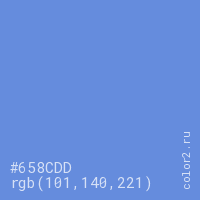 Цвет #658CDD в цветовой модели RGB обозначается тремя октетами (101, 140, 221) в десятичном формате и #658CDD в шестнадцатиричном (hex) формате, которые являются интенсивностью красного 101 (hex 65), интенсивность зелёного 140 (hex 8C) и интенсивность синего 221 (hex DD).