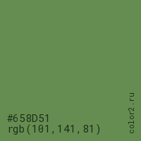Цвет #658D51 в цветовой модели RGB обозначается тремя октетами (101, 141, 81) в десятичном формате и #658D51 в шестнадцатиричном (hex) формате, которые являются интенсивностью красного 101 (hex 65), интенсивность зелёного 141 (hex 8D) и интенсивность синего 81 (hex 51).