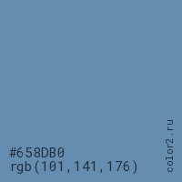 Цвет #658DB0 в цветовой модели RGB обозначается тремя октетами (101, 141, 176) в десятичном формате и #658DB0 в шестнадцатиричном (hex) формате, которые являются интенсивностью красного 101 (hex 65), интенсивность зелёного 141 (hex 8D) и интенсивность синего 176 (hex B0).