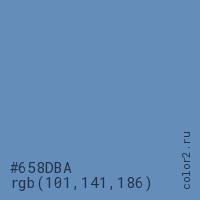 Цвет #658DBA в цветовой модели RGB обозначается тремя октетами (101, 141, 186) в десятичном формате и #658DBA в шестнадцатиричном (hex) формате, которые являются интенсивностью красного 101 (hex 65), интенсивность зелёного 141 (hex 8D) и интенсивность синего 186 (hex BA).