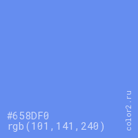 Цвет #658DF0 в цветовой модели RGB обозначается тремя октетами (101, 141, 240) в десятичном формате и #658DF0 в шестнадцатиричном (hex) формате, которые являются интенсивностью красного 101 (hex 65), интенсивность зелёного 141 (hex 8D) и интенсивность синего 240 (hex F0).