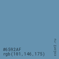 Цвет #6592AF в цветовой модели RGB обозначается тремя октетами (101, 146, 175) в десятичном формате и #6592AF в шестнадцатиричном (hex) формате, которые являются интенсивностью красного 101 (hex 65), интенсивность зелёного 146 (hex 92) и интенсивность синего 175 (hex AF).